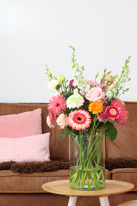 Met een overvloed aan bloemen en de handige tip met de tape, maakten we allemaal in een handomdraai een prachtig boeket. Kleine uitdaging was nog wel om de bloemen (met vaas) heel in de tram, trein, auto en uiteindelijk thuis te krijgen. Maar het is gelukt en na even bijkomen in vers water staan de bloemen nog steeds te schitteren bij ons in de woonkamer. Gerbera’s, ze behoren nog steeds tot mijn favoriete bloemen!